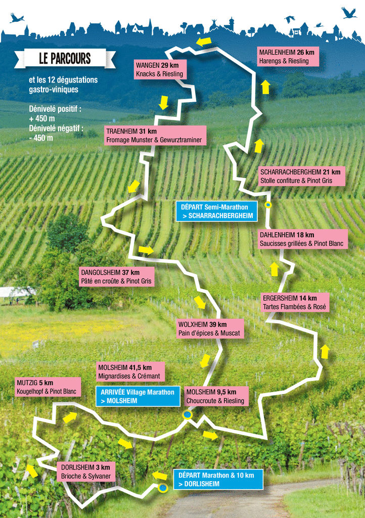 Les viticulteurs et fins gourmets de la région de Molsheim vous concoctent plusieurs ravitaillements "gastro-viniques" tout au long des parcours du marathon, du semi-marathon, du 10 km, de la marche nordique et de la marche du coeur.